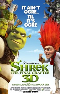 Canımız ciğerimiz yeşil devimiz Shrek son macerasıyla karşımızda. Shrek 4ever after (Shrek Sonsuza kadar mutlu) serinin ilk 3boyutlu yayınlanan ilk filmi olarak diğerlerinden bir adım önde üçüncü boyutun getirdiği canlılıkla daha başka daha güzel bir seyirlik sunuyor. Sinema sanatının en başından beri insanı ve dolayısıyla gerçeği perdeye yansıtma amacı son yıllardaki manevi gerçeklik olmasa da maddi gerçeklik adı altında görüntülerde sağlanan üçüncü boyutun derinliği insanı her türlü derinden etkiliyor. Yani kısacası bir bakıma bağımlılık yapan bir durum.Yıllarca filmleri iki boyutu izleyip üçüncü boyutun tadını aldıktan sonra insan normal film izlemek istemiyor.Hele hele haberlerde çıkan uzakdoğudaki sinemaların birinde 4. boyuta geçildiği ,filmdeki efektlerin devamı olarak titreşim, ses,yağmur ve koku efektinin verilmesi bu işin sonu galiba.Henüz öyle bir deneyim yaşamadım ama eğer yaşarsam iki boyulu filmlerin gözümde hiçbir değeri kalmayacağı kesin.