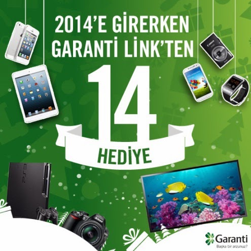 Yıl boyunca farklı kampanyalarla fırsatlar sunan Garanti Link, 2014’e girerken çuvalını hediyelerle doldurmuş bir Noel Baba gibi bacanızdan inmeye hazırlanıyor. Günde en az 10 kere kontrol ettiğimiz sosyal medya hesaplarımızı Garanti Link ile Link’leyerek 14 şahane hediyeden birini kazanmaya hak kazanıyoruz. Televizyondan tablet bilgisayara, telefondan fotoğraf makinasına kadar birbirinden değerli hediyelerden birine sahip olmak çok da kolay. Benim dileğim yeni yılda sevdiklerimle her anımı ölümsüzleştirebileceğim bir fotoğraf makinası. Sizin dileğiniz ne?