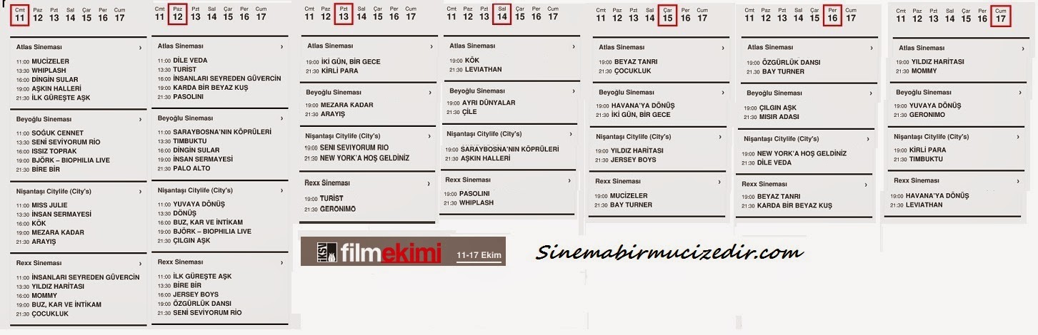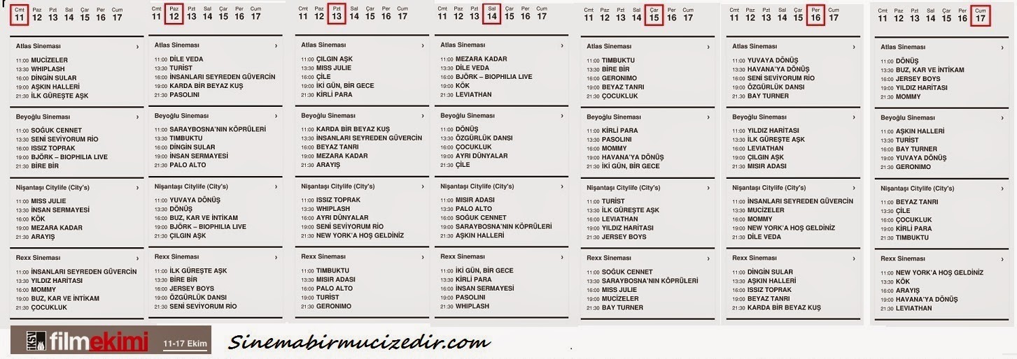 Ekimde istanbul film festivaliyle güzel. Havalar yavaş yavaş soğumaya başladığı günlerde klişe tabirle içimizi ısıtan gönlümüzün sultanı film ekiminin programı belli oldu. Sitesine bir kaç gündür girmeye çalışıyordum. En sonunda bugün girmeyi başardım ve el emeği göz nuru programını siz sinema severler için hazırladım. Haftaiçi gündüz seanslarına gidemeyecek 9-5 çalışanlar için belediyemizin bir hizmeti daha. Gidemeyeceğiniz seansları görüp iç geçirmemek için alttaki programa bakmanız şiddetle tavsiye olunur. Keyifli seyirler.