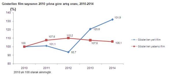 Sinema salonlarında gösterilen film sayısı son beş yılda %15,3 arttı. Son beş yılda gösterilen yerli film sayısı %31,9 artarken, gösterilen yabancı film sayısı %6,1 arttı. Gösterilen film sayısı 2014 yılında, 2013 yılına göre %2,7 arttı. 2014 yılında gösterilen yerli film sayısı %9,4 artarken, gösterilen yabancı film sayısı %1,4 azaldı.