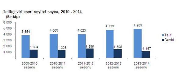 Türkiye genelinde sinema seyirci sayısı son beş yılda %54,7 arttı. Bu dönemde yerli film seyirci sayısı %72,2 artarken, yabancı film seyirci sayısındaki artış oranı %37,1 oldu. 2014 yılında, 2013 yılına göre sinema seyirci sayısı %22,9 artarak 55 milyon 378 bin 716 oldu. Yerli film seyirci sayısı %24,2 artarak 30 milyon 994 bin 840 kişi olurken, yabancı film seyirci sayısı %21,2 artarak 24 milyon 383 bin 876 kişiye ulaştı.