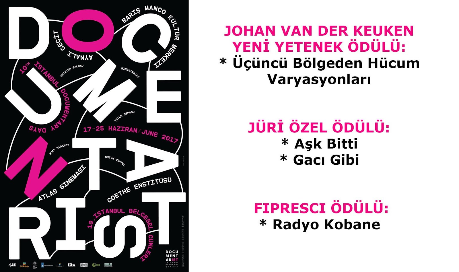 DOCUMENTARIST 10. İstanbul Belgesel Günleri’nin ödülleri belli oldu. Johan van der Keuken Yeni Yetenek Ödülü “Üçüncü Bölgeden Hücum Varyasyonları”na giderken “Aşk Bitti” ve “Gacı Gibi” filmleri Jüri Özel Ödülü aldı. Festivalin FIPRESCI Ödülü ise “Radyo Kobane”ye verildi.25 Haziran Pazar gecesi sona erecek olan DOCUMENTARIST 10. İstanbul Belgesel Günleri’nin ödülleri açıklandı. İlk veya ikinci filmiyle festivale katılan yeni yönetmenleri desteklemek amacıyla verilen Johan van der Keuken Yeni Yetenek Ödülü, Sedat Şahin ve Murat Adıyaman’ın yönettiği Hakkarigücü Kadın Futbol Takımının hikâyesini anlatan “Üçüncü Bölgeden Hücum Varyasyonları” filmine verildi. Braxton Hood, Gülen Güler, Yusuf Güven, Ayşe Çetinbaş ve Selim Yıldız‘dan oluşan jüri, Mert Kaya’nın “Aşk Bitti” ve Serkan Çiftçi’nin “Gacı Gibi” filmlerini de Jüri Özel Ödülü’ne layık gördü. Yeşim Tabak, Yeşim Burul ve Şenay Aydemir’den oluşan FIPRESCI (Uluslararası Film Eleştirmenleri Federasyonu) Ödülü ise Reber Dosky’nin yönettiği “Radyo Kobane” (Radio Kobani) filmine gitti.